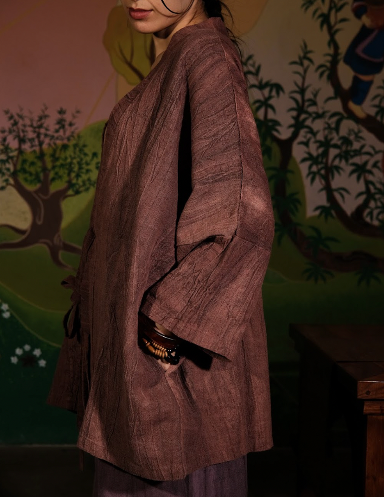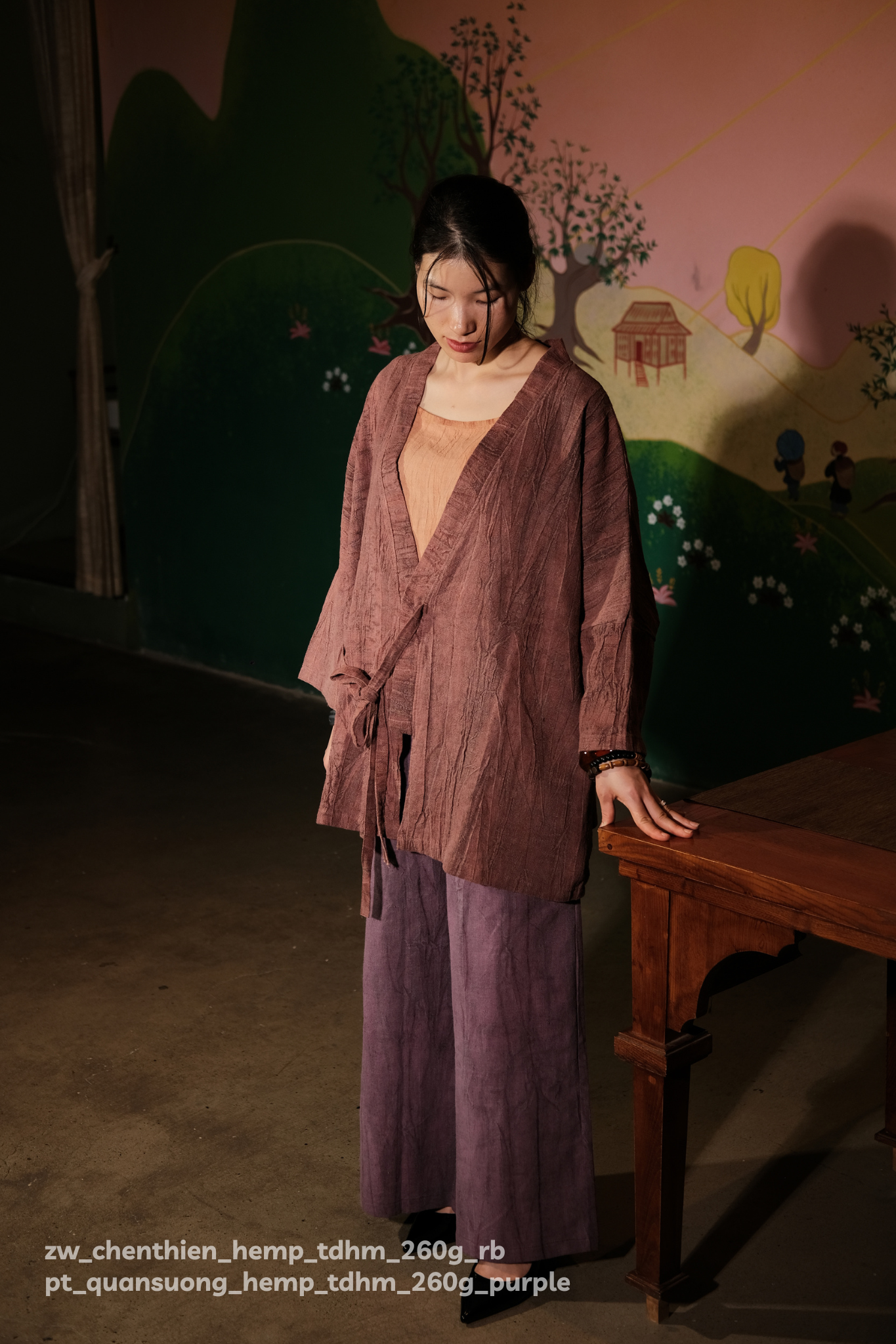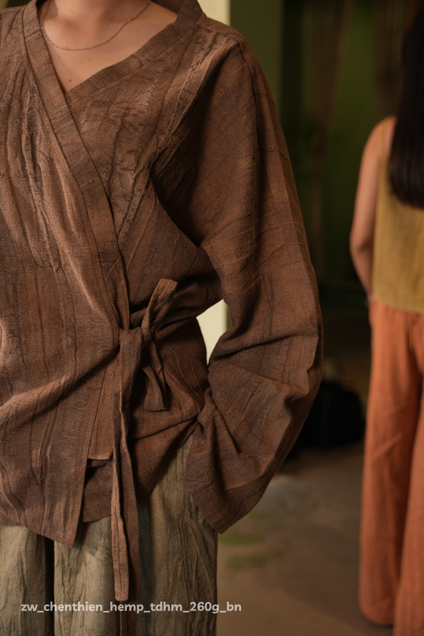 Áo chén thiền hai vạt thắt nút vải gai dầu nhuộm loang