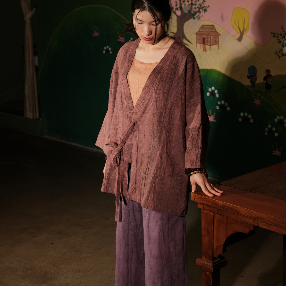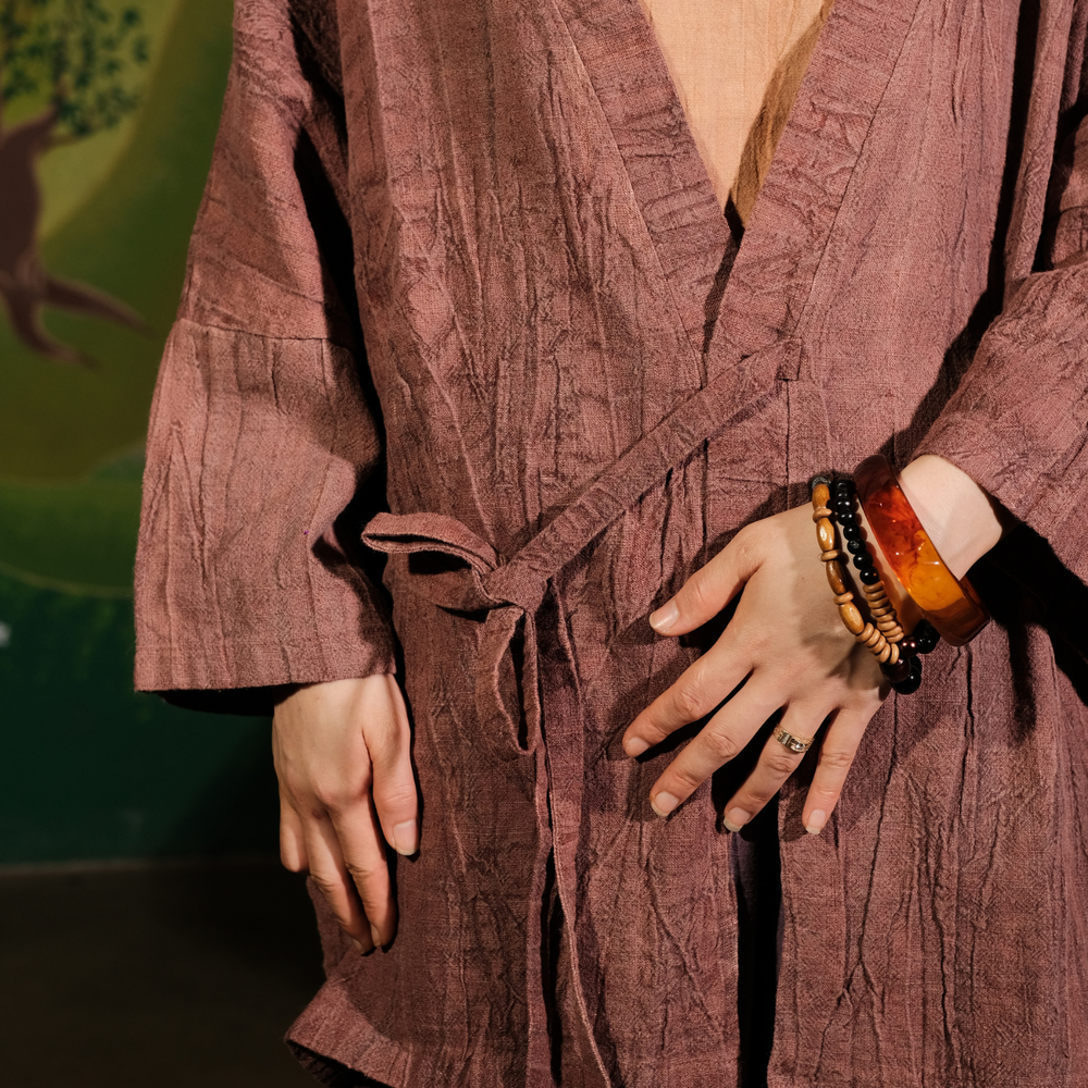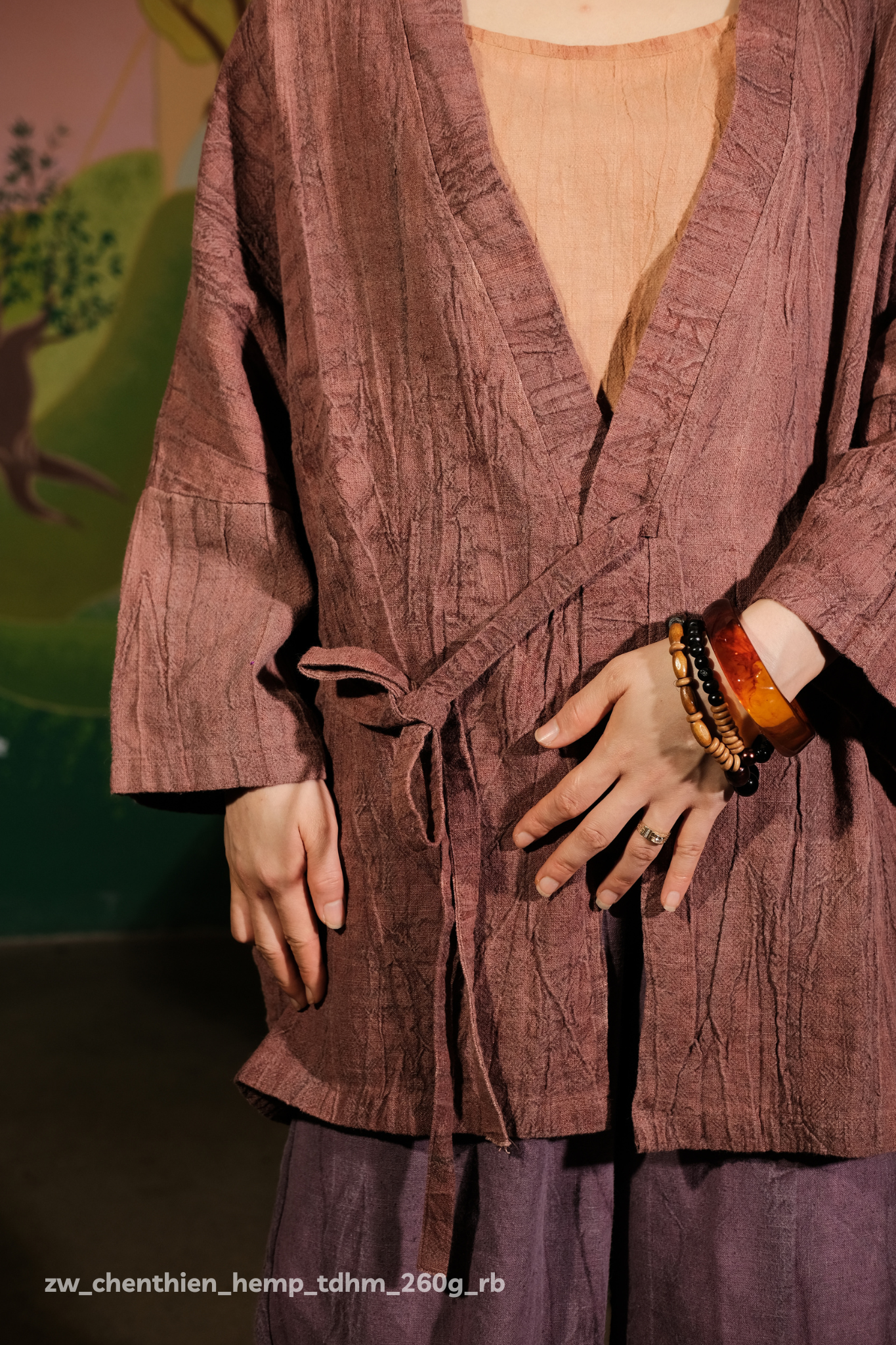 Áo chén thiền hai vạt thắt nút vải gai dầu nhuộm loang
