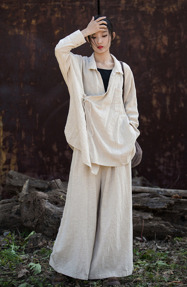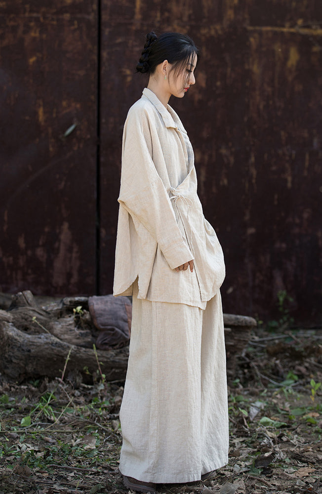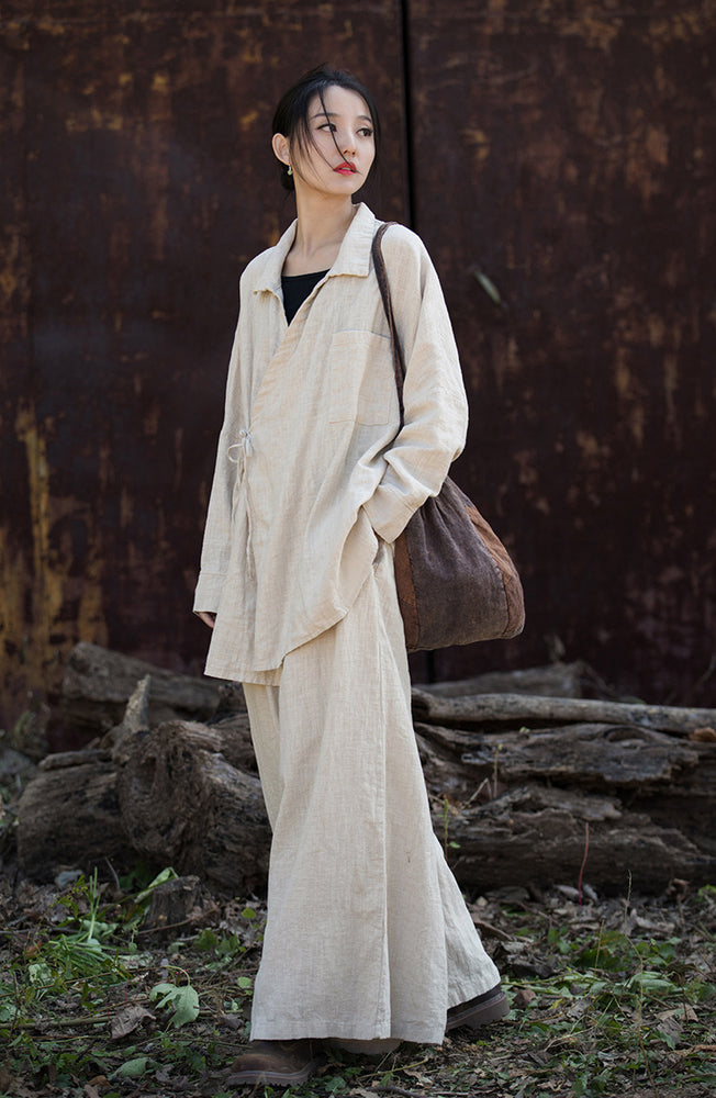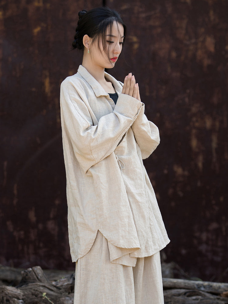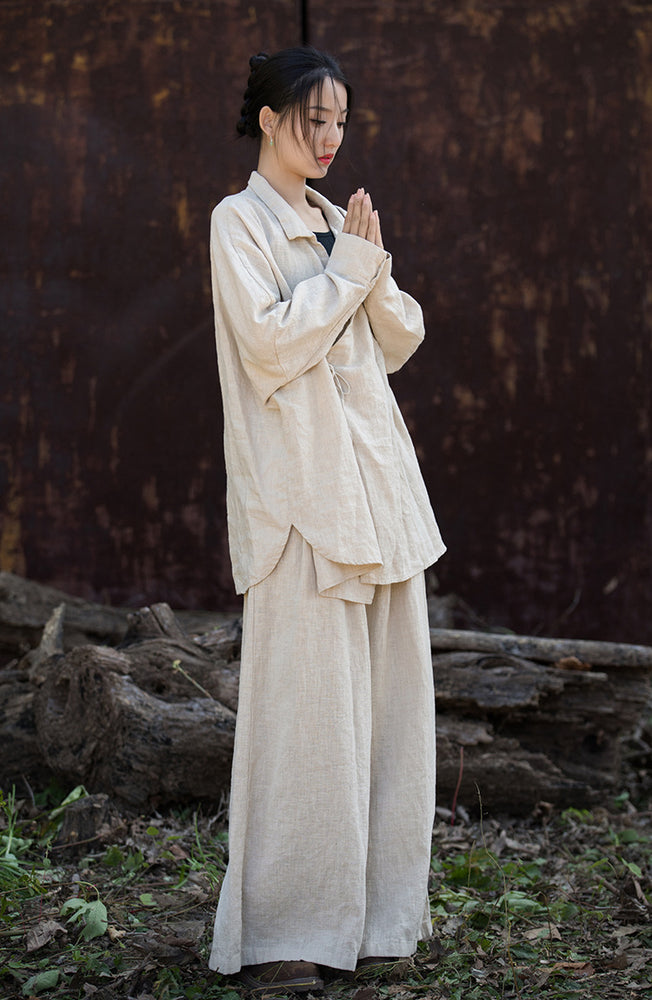 Áo chén thiền: Khoác buộc, dáng suông nhẹ nhàng chất liệu thoáng mát. Quần chén thiền với độ loe vừa phải tôn dáng thanh thoát. Vẻ đẹp kín đáo ý nhị và thanh tịnh.