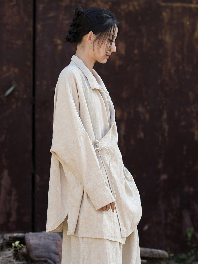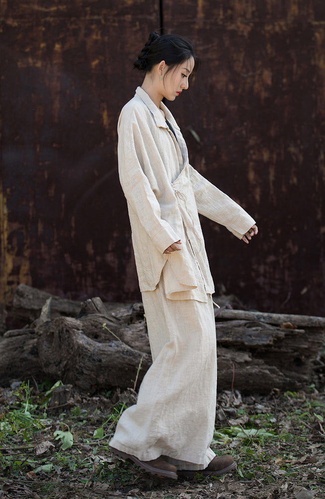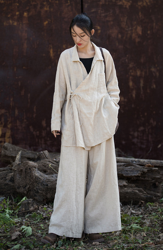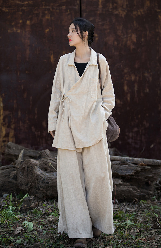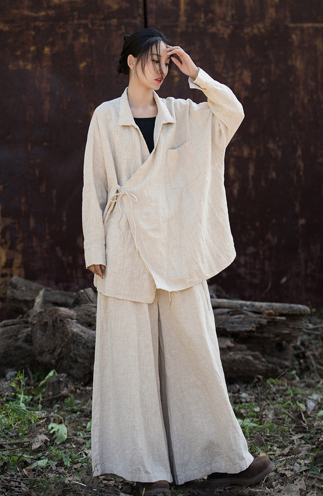 Áo chén thiền: Khoác buộc, dáng suông nhẹ nhàng chất liệu thoáng mát. Quần chén thiền với độ loe vừa phải tôn dáng thanh thoát. Vẻ đẹp kín đáo ý nhị và thanh tịnh.