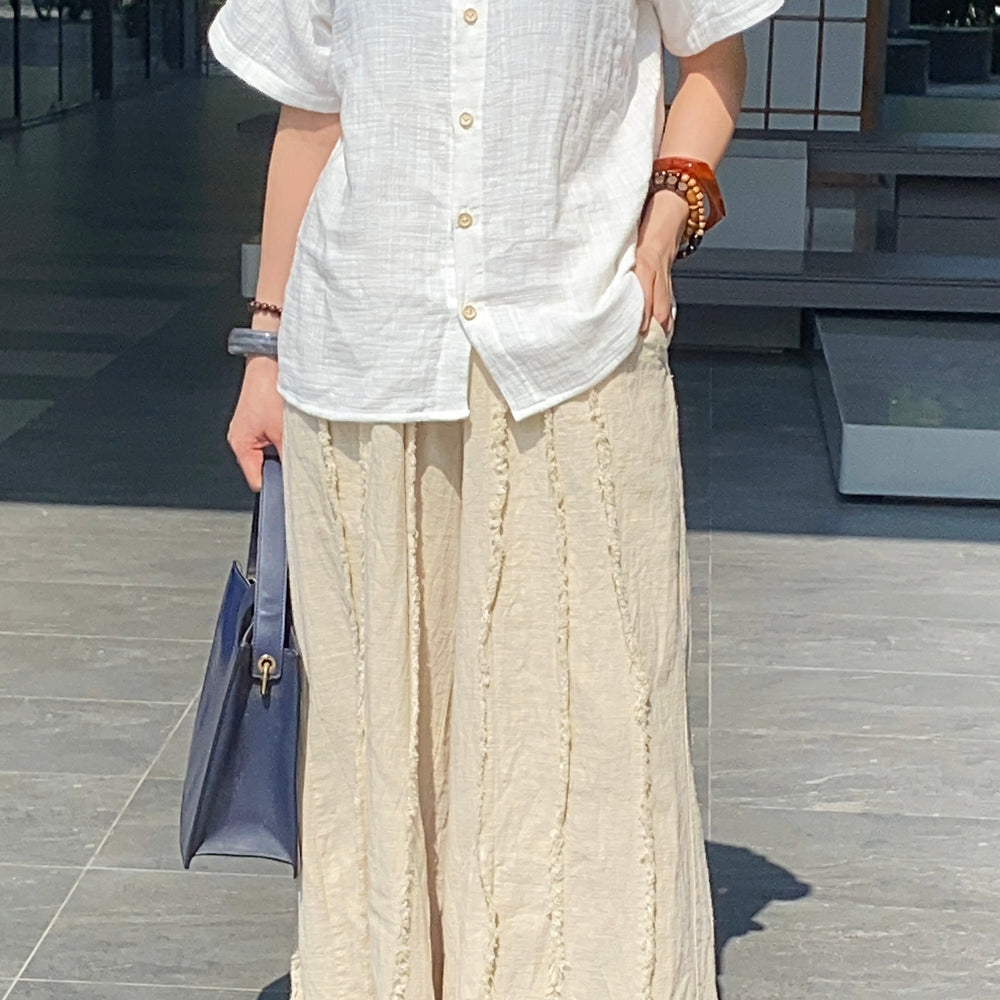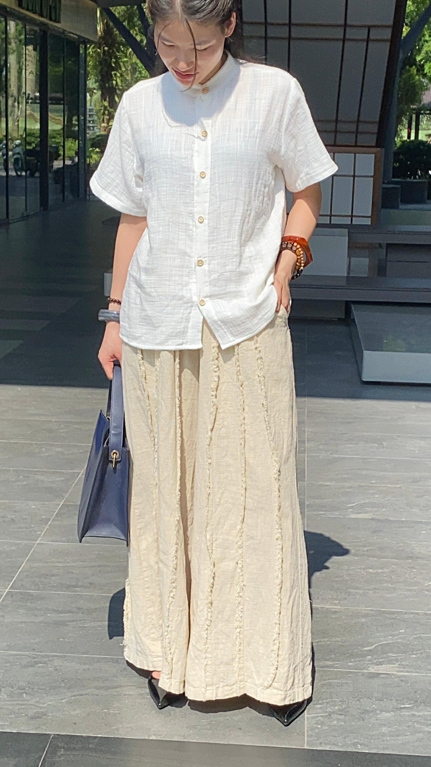 Nhẹ như một làn gió sớm, chiếc áo Mây Hạ được dệt từ vải lanh tơ (80% lanh, 20% bông) – chất liệu mềm mại, rủ nhẹ và có độ trong mờ vừa đủ để gợi cảm giác mong manh, nữ tính.
