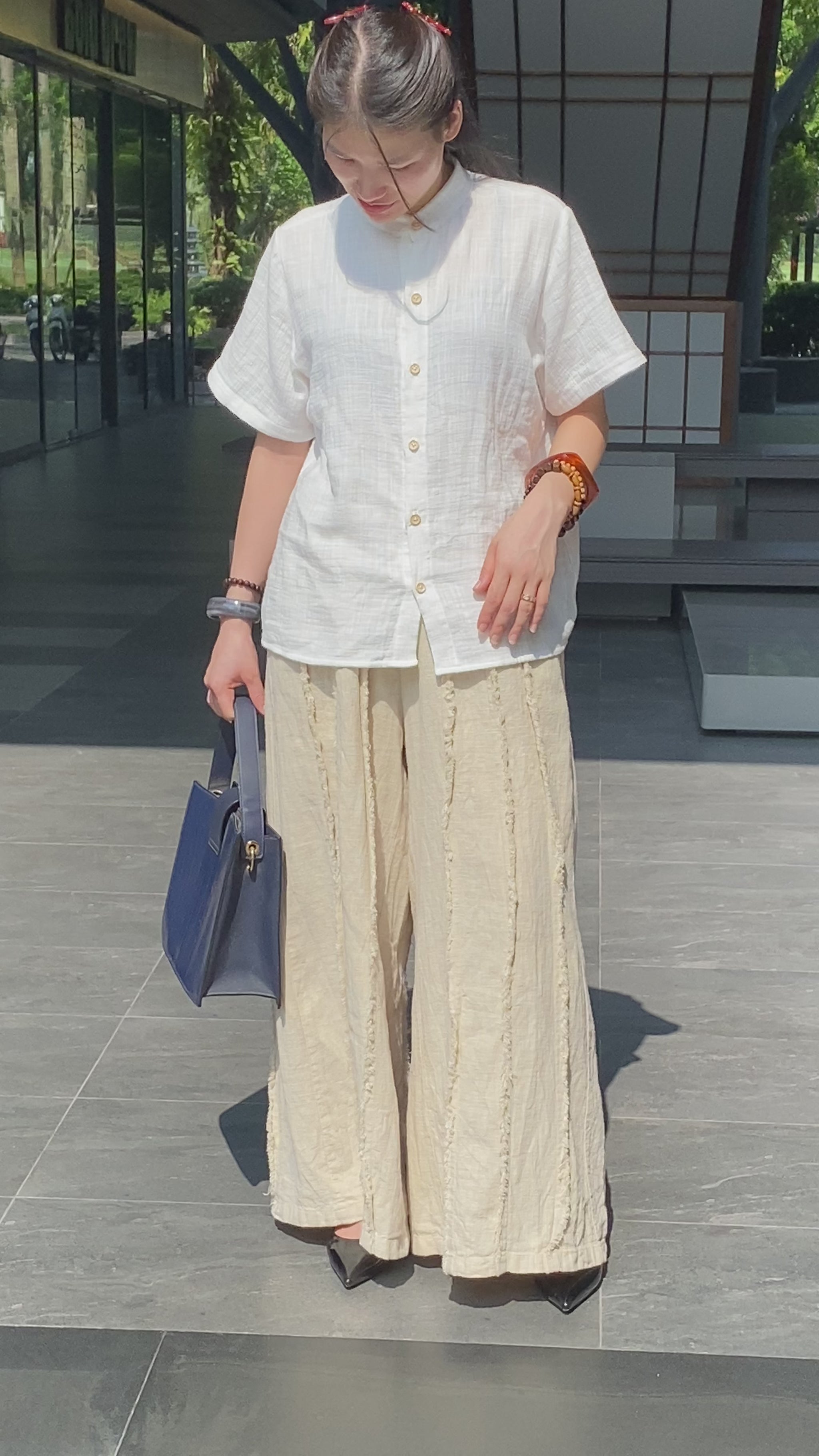 Phom áo cổ đứng, tay ngắn, thoáng và linh hoạt, dễ phối cùng quần ghép mảnh chữ A tạo nên tổng thể nhẹ nhõm, thanh thoát.
